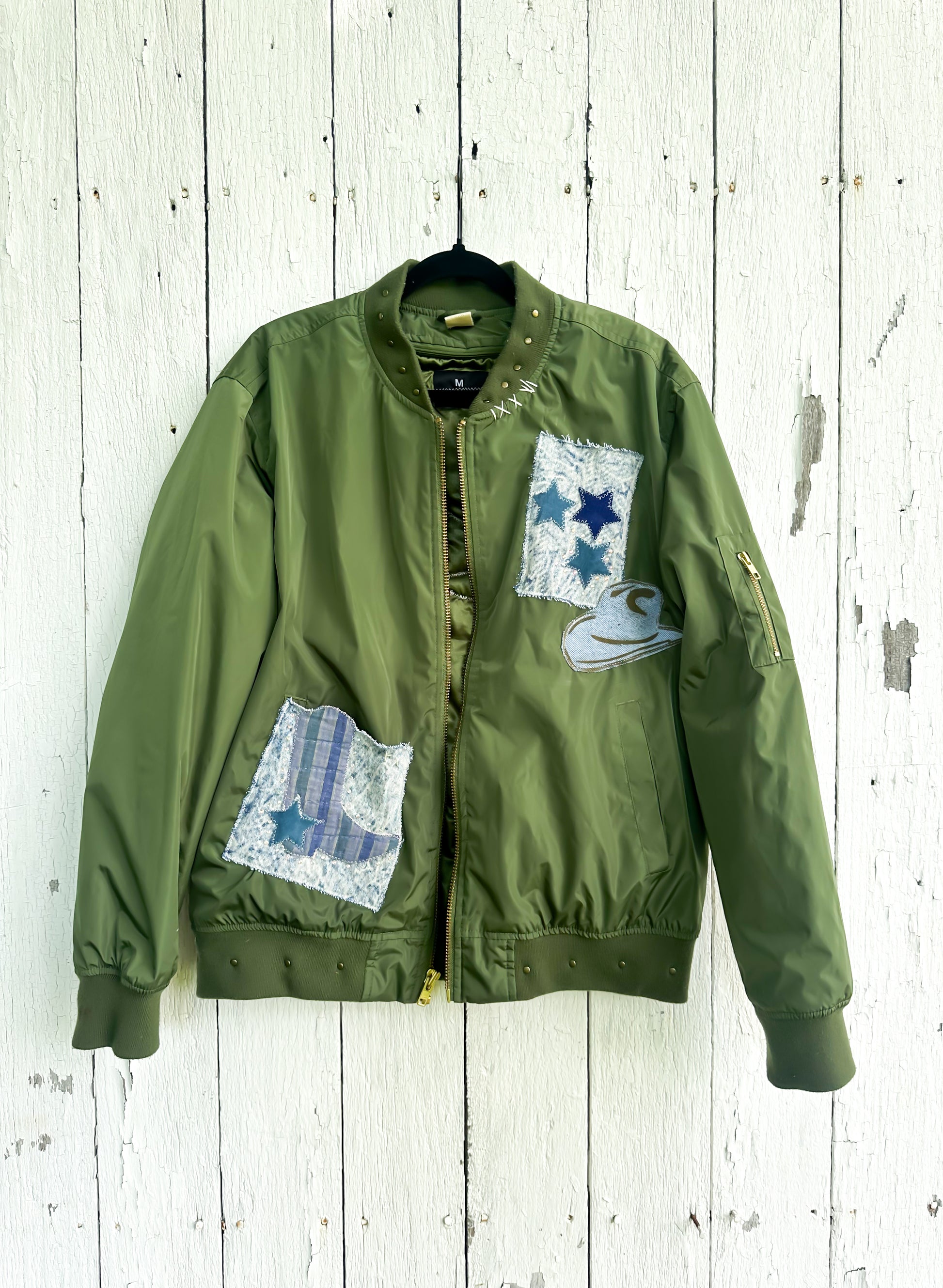 •This is a second hand jacket, sewn fabric patches, quilted boot patch embellishments, sewn painted patches, attached rhinestones and rivets to collar and trim